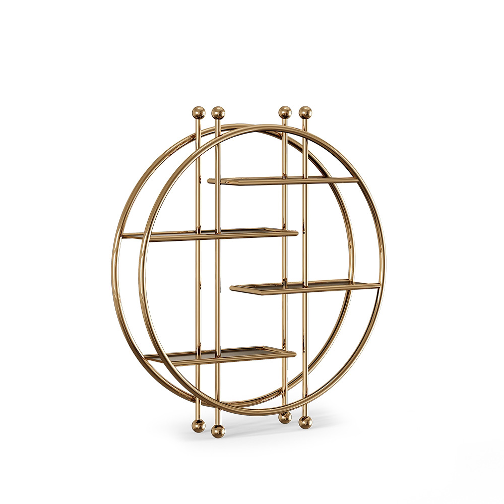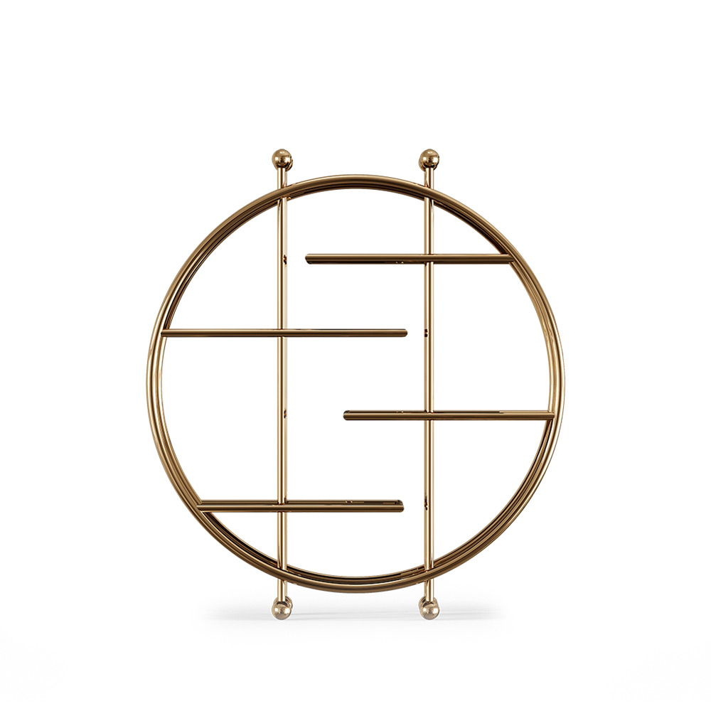 The Golson bookcase is a monumental piece with a distinctive presence, built around a polished brass structure holding four shelves. A striking circular shape that is not just trendy but also extremely enticing for all the retro lovers that want an item with a modern twist.