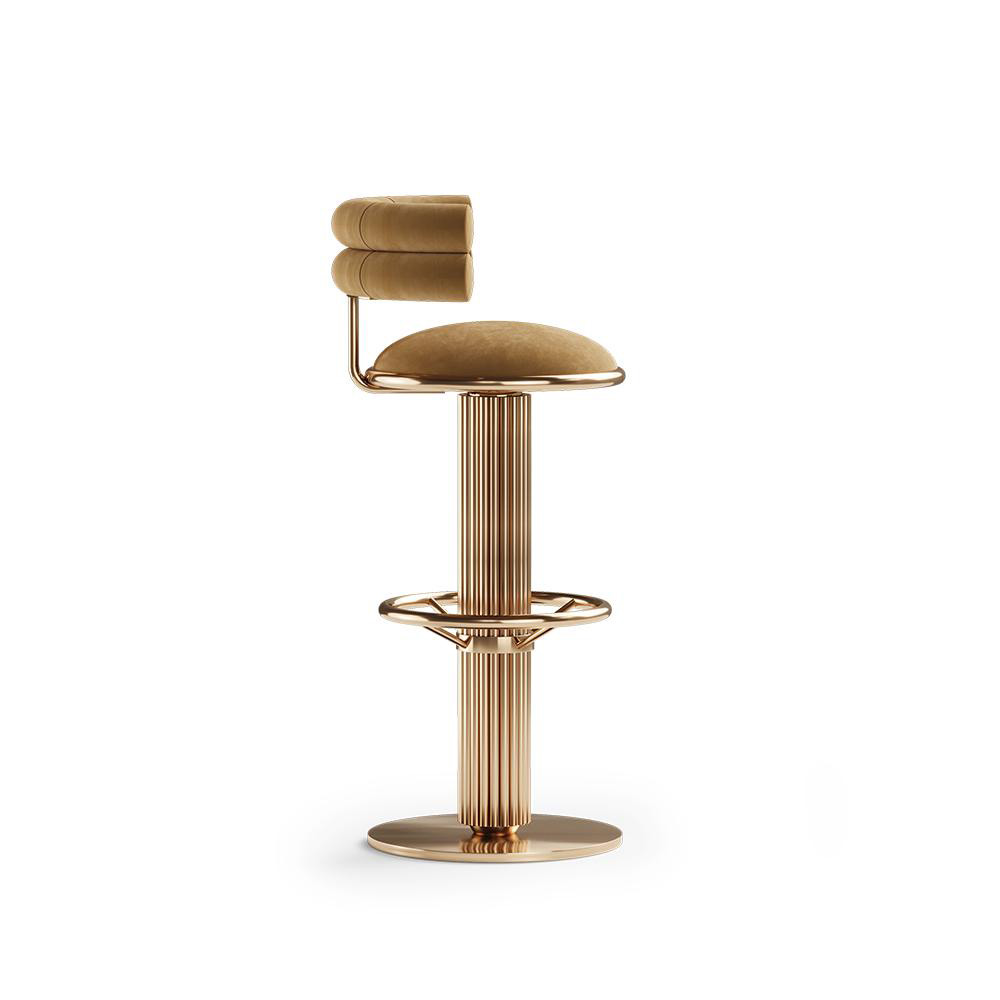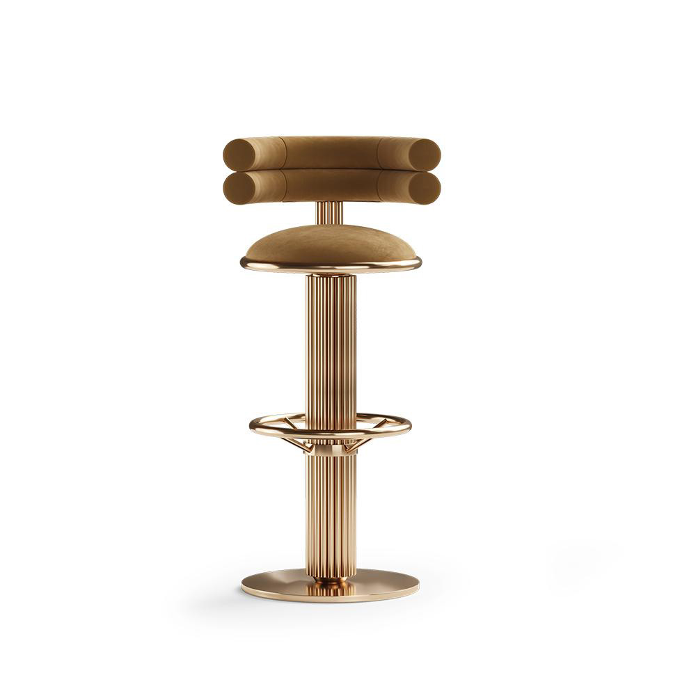 The Mulligan bar chair I has a remarkable design, dazzling for the brass details. The geometric foot, which is covered by an edgy paneling, contrasts with the color of the upholstery. Mulligan’s design is a light approach to the mid-century style, bringing to any modern bar or kitchen a fresh look.