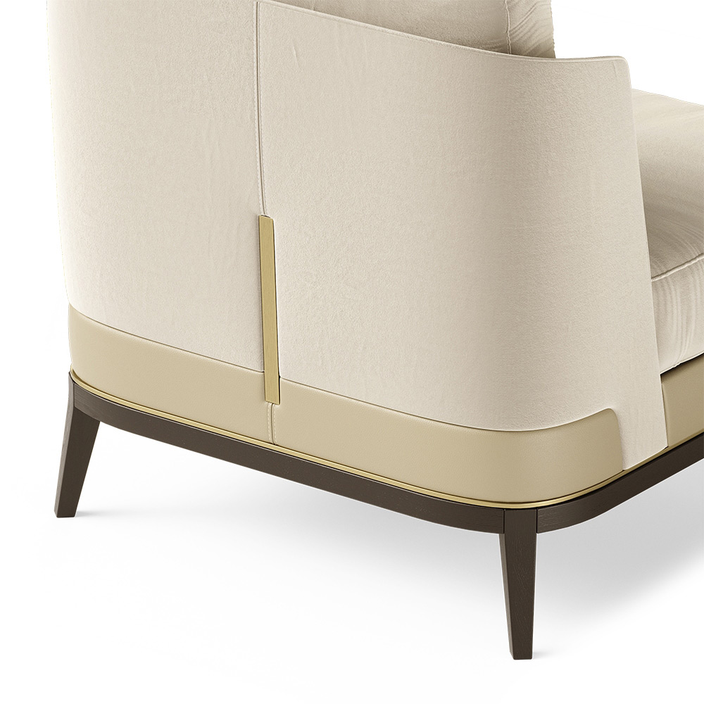 With a timelessly elegant design, the Arthur armchair features simple and clean lines. The ample seat upholstered by a soft and pleasant velvet fabric guarantees comfort, contrasting attractively with the leather in a neutral tone covering the seat’s structure.
