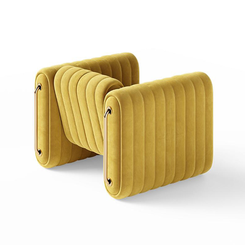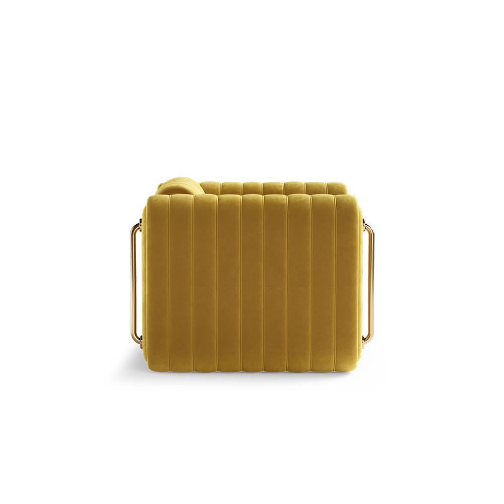 Jim Armchair is an impressive mid-century modern piece, combining architectural precision with luxurious comfort. Designed with a sculptural silhouette, its vertically channeled upholstery creates a striking visual rhythm, enhancing both aesthetics and ergonomics. The curved armrests, adorned with sleek metallic accents, bring a sophisticated contrast, evoking the opulence of vintage luxury interiors. Resting on a hidden base, this chair appears to float effortlessly, making it an exquisite focal point for elegant contemporary spaces.