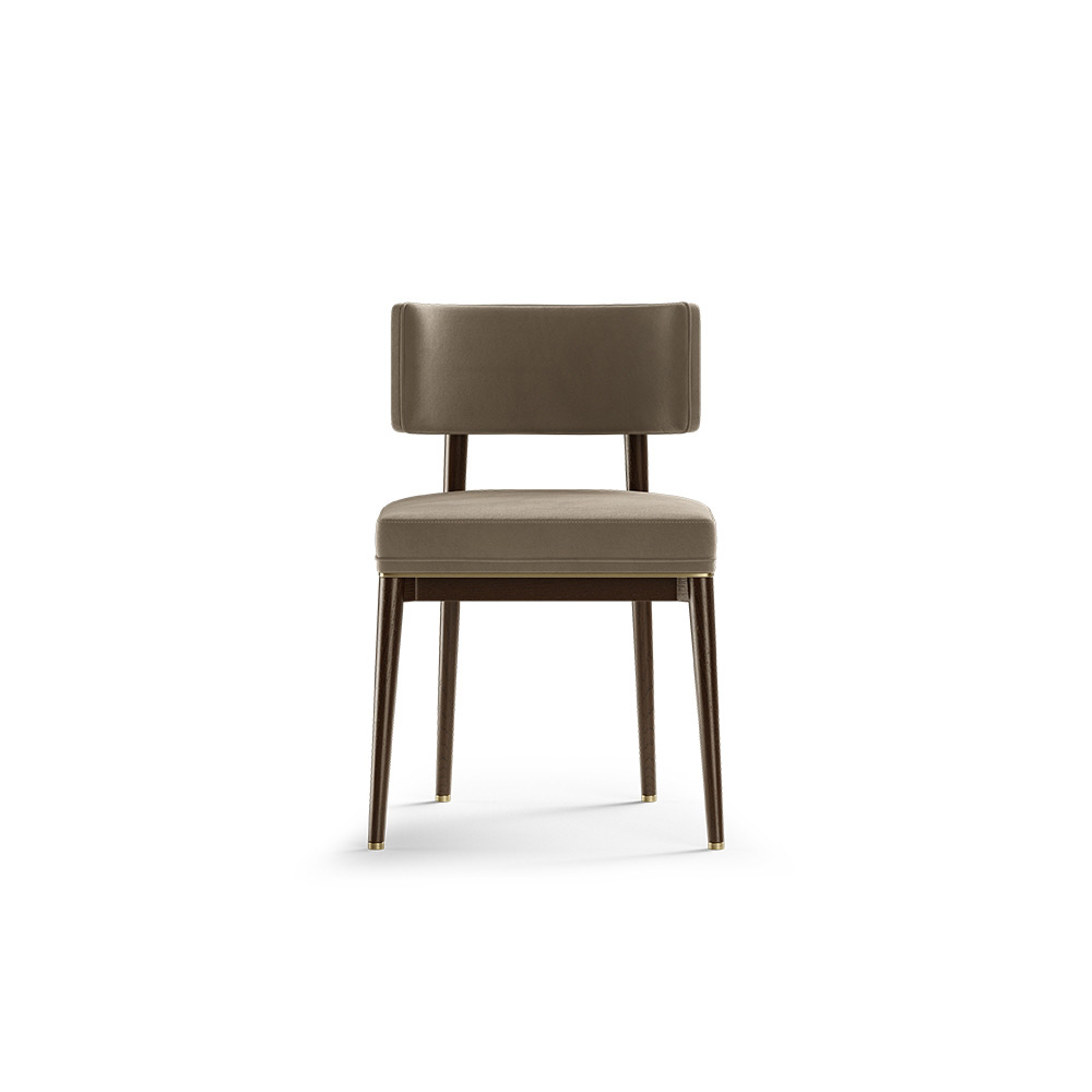 The exposed legs support a deep upholstered seat, which is elegantly embellished with an almost invisible brass feature, while the upper wood body guides the eye through a generous backrest in a rectangular shape. A minimalistic design that ensures the necessary comfort.