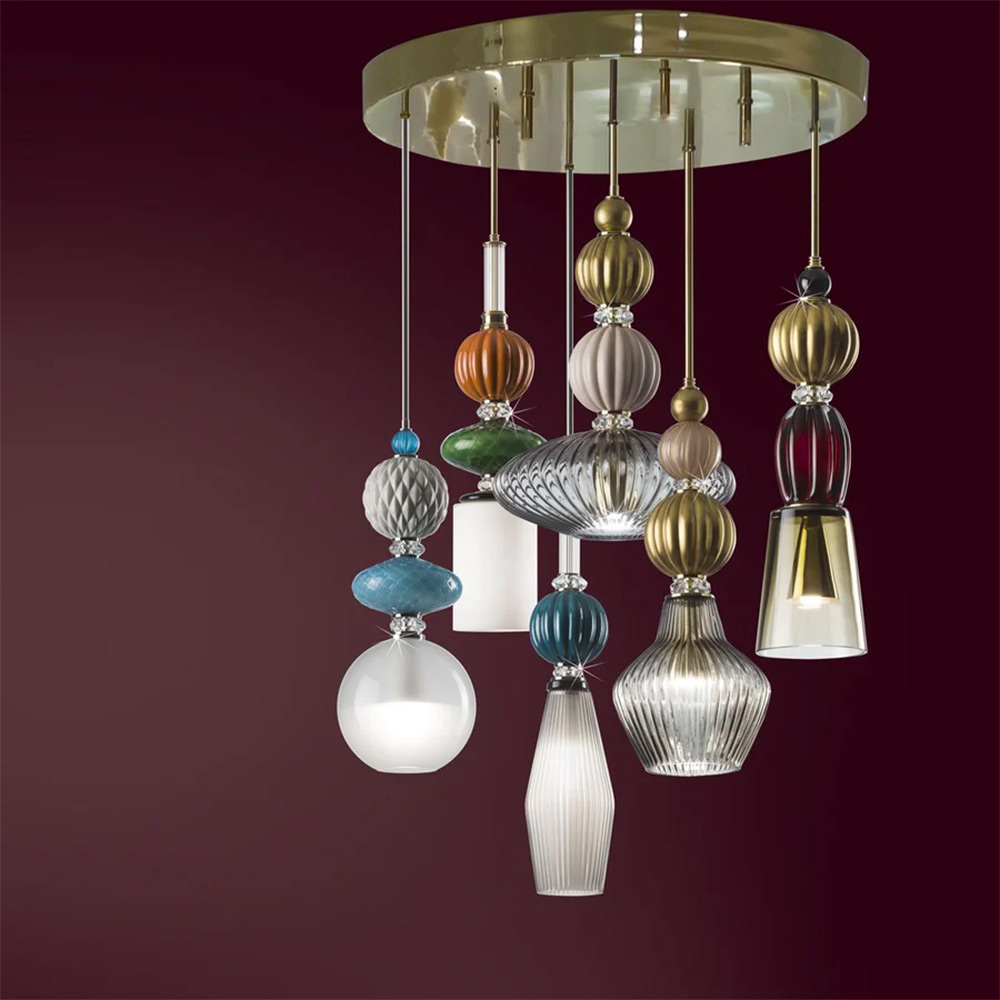 This chandelier is part of the Divas Collection, paying homage to the Hollywood stars of the ’40s. Sophistication and character combine in this superb masterpiece dedicated to the unique personalities of Lola Todd, Audrey Hepburn, Grace Kelly, Ava Gardner, Rita Hayworth and Greta Garbo. This exquisitely opulent light featuring an array of pendant lights suspended from a 24 ct gold plated brass disc are inspired by jewels. A unique juxtaposition of uniquely shaped and embossed porcelain and mouth blown Murano glass makes each of the six pendants exude luxury, emanating a soft glow and grouped together, this light will make a fabulous statement piece in any interior. Be prepared to be mesmerised! The height of this chandelier is 205 cm and is adjustable on special request.