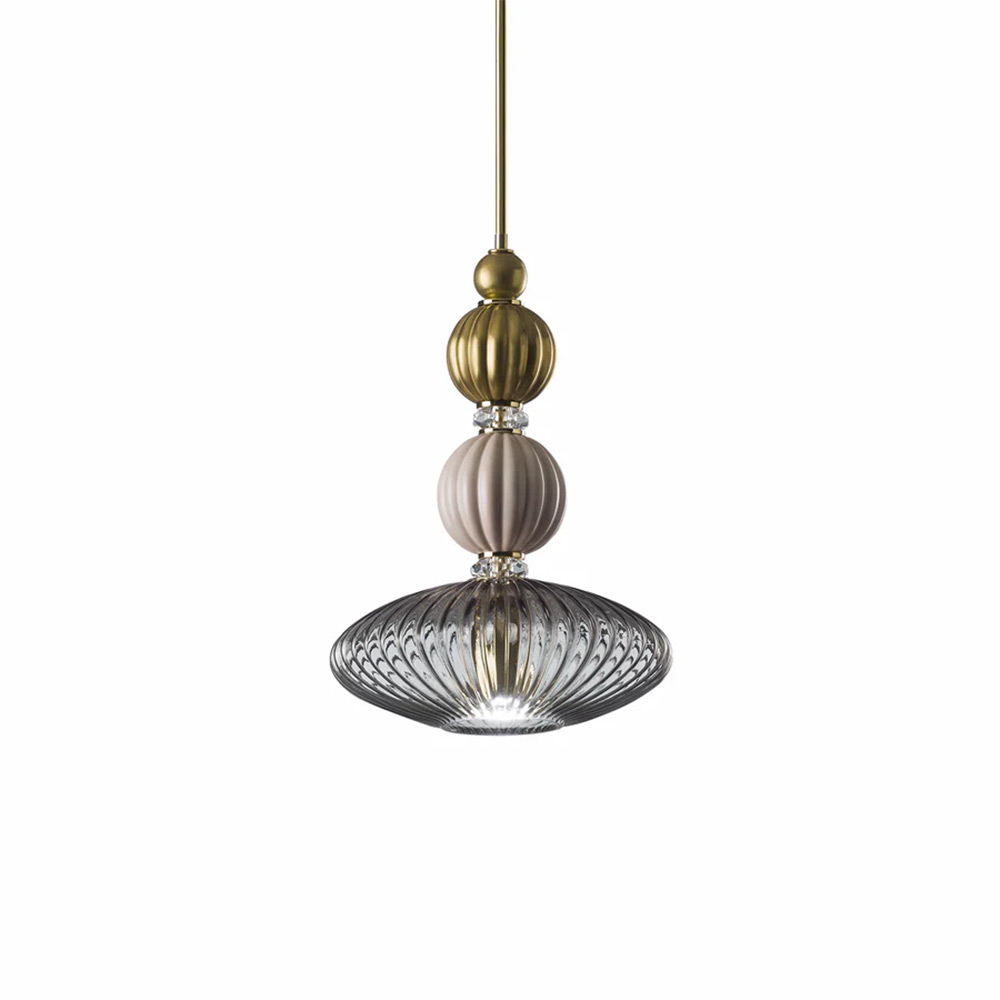 This string pendant lamp is part of the Divas Collection, paying homage to the Hollywood stars of the ’40s. Sophistication and character combine in this superb masterpiece dedicated to the unique personality of Rita Hayworth. Both opulent and sensual, the silhouette of this piece combines brass, the finest porcelain, and mouth-blown Murano glass in a series of grooved elements juxtaposed for a sublime effect. The total height of the piece (200 cm) is adjustable.