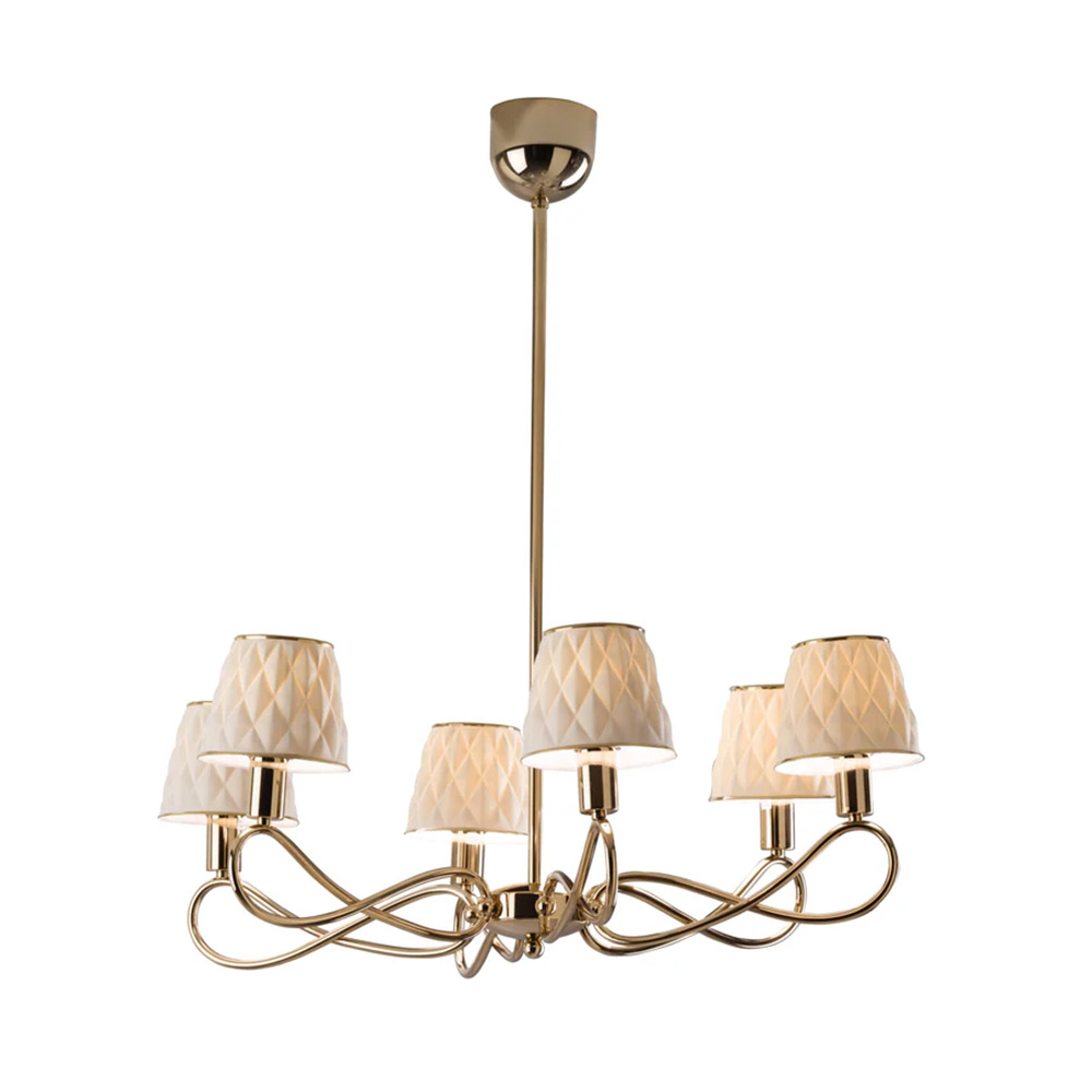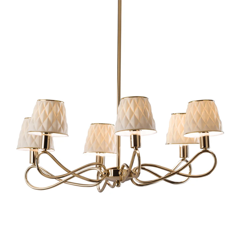 Supported by a sturdy brass frame, this spectacular Infinity chandelier strikes with its exceptional elegance. Its tiered silhouette comprises 6 sinuous arms, each sustaining a refined lampshade crafted of matte white porcelain. By folding on themselves, the arms produce a captivating sense of movement. The deeply embossed 3D style all over diamond shaped pattern on the lamp shades lends this piece an ornate sophistication.The overall effect is simultaneously ethereal and striking. Team with matching Infinity lighting accessories to complement the look.