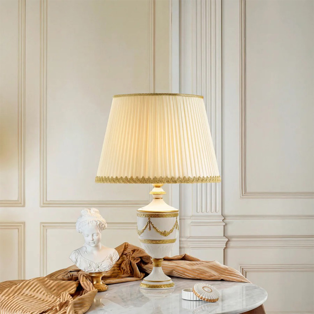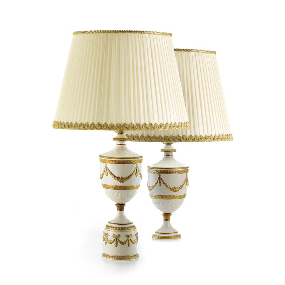 The unmistakeable characteristics of a refined classic look form the basis of the Josephine table lamp. A fine porcelain base and body accented with raised relief swags and decorative borders in 24 ct gold; and punctuated with an ivory silk ruched lampshade with gold trimmings redefine ‘elegance’. Team with matching Josephine lighting to complement the look.