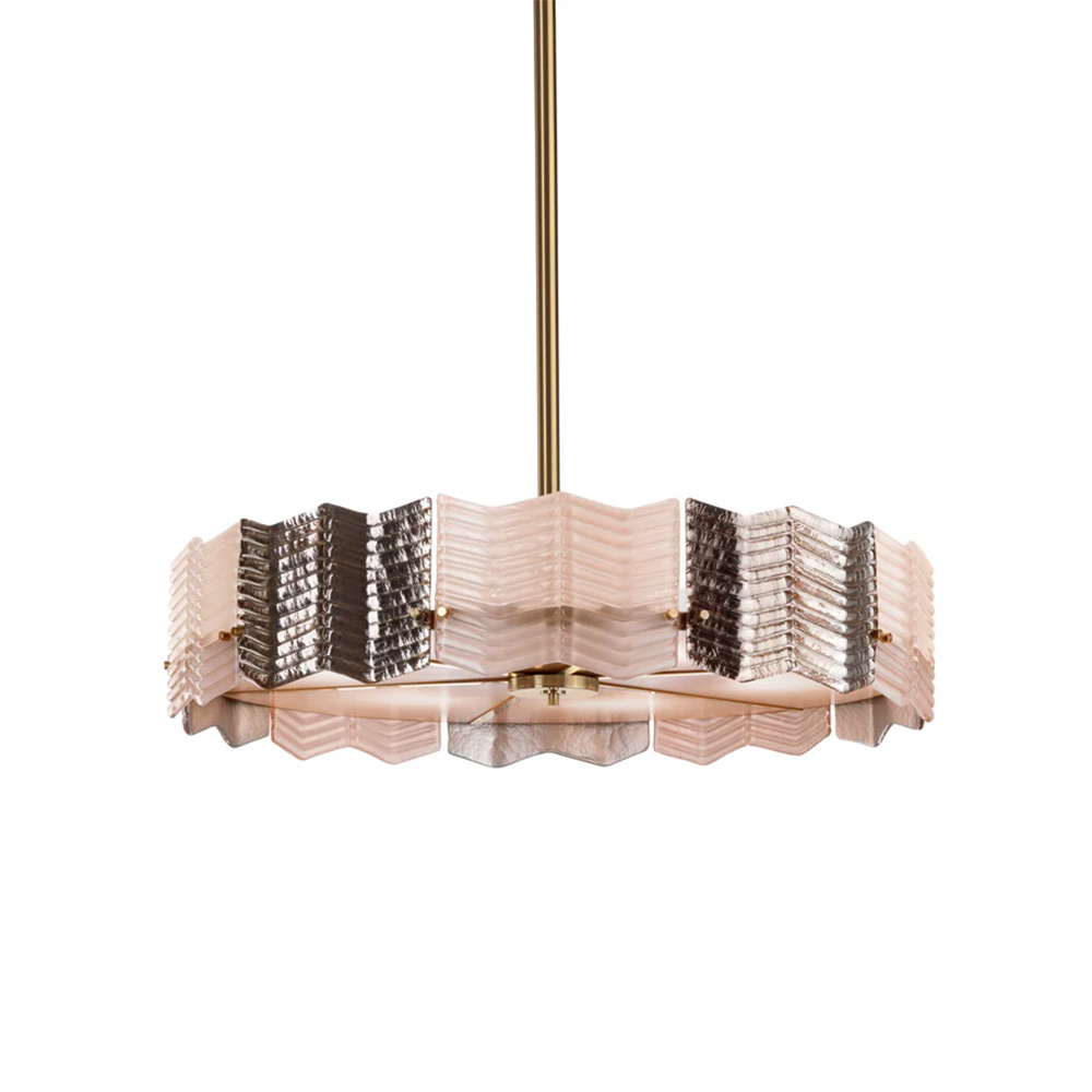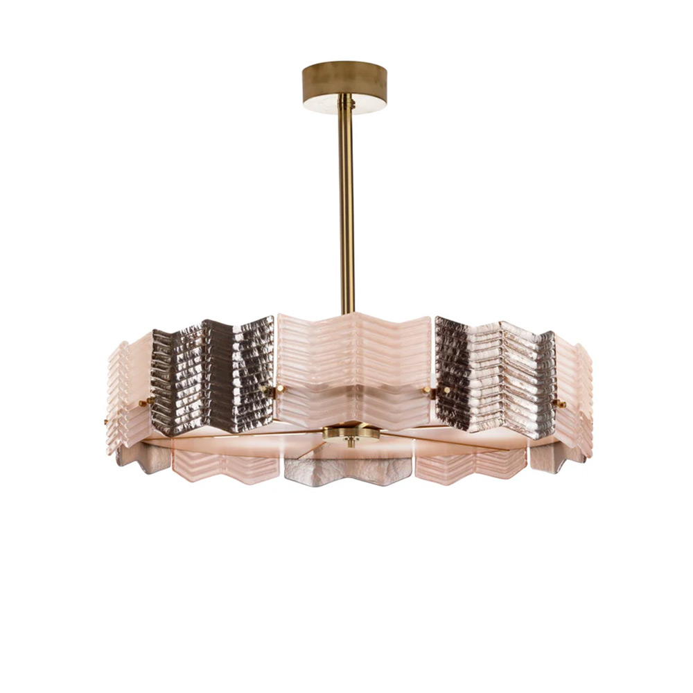 Kate is a elegant chandelier. Intriguing geometric detailing accented with an alternation of silvery and light-pink hues defines the glamorous appeal of this chandelier, incorporating a minimalist, golden-finished metal frame. The zig-zagged profiles and herringbone, grooved texture characterizing the shading Murano glass belt emphasizes its dynamic appearance, also revealed by mesmerizing games of lights and shadows that get projected in the surroundings.