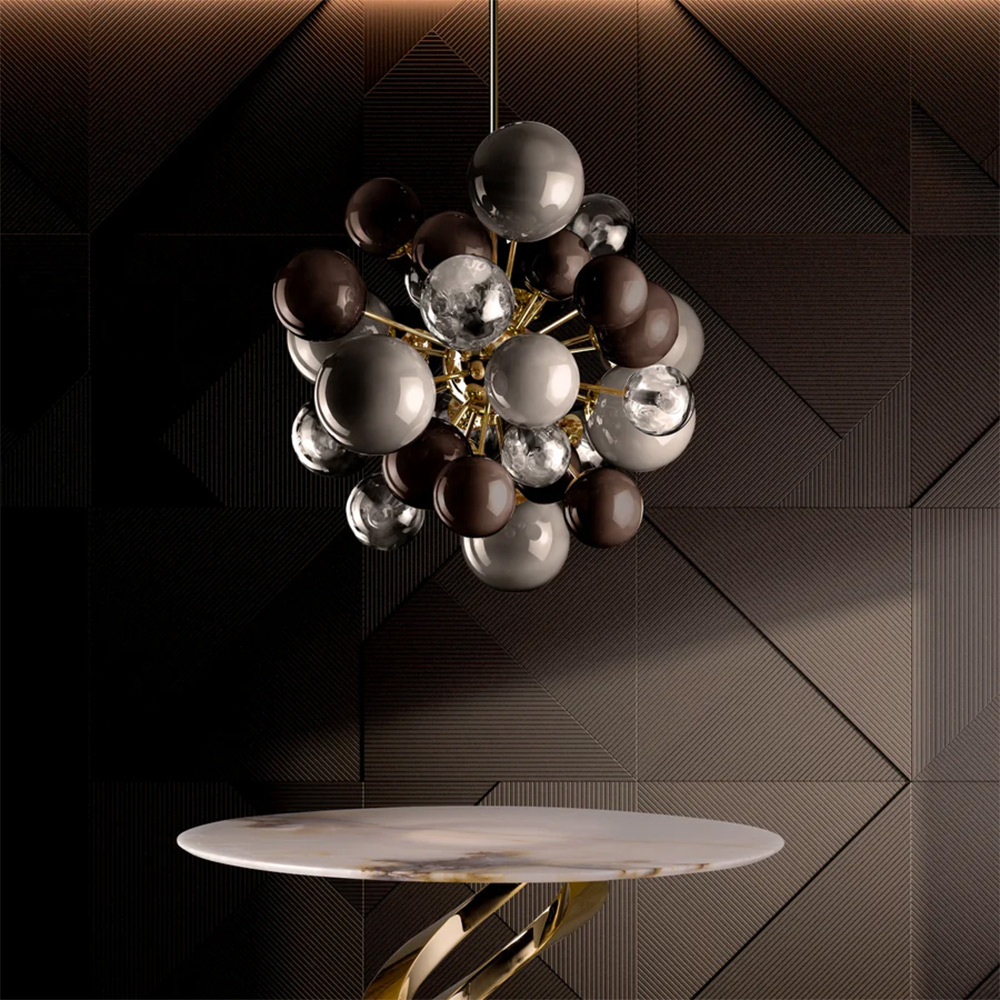 Give your home a glamourous touch with this Lady V chandelier, inspired by classic Hollywodian glamour. LADY V is imaginary mane representing some of the last century most famous women, known for their unmistakable charms. The 24ct gold plated brass structure of the chandelier comprises a central sphere that serves as a base for the 32 stems, each ending in a splendid illuminated Murano glass sphere in deliacte grey and brown tabacco color hue. The Lady V chandelier is a tribute to femininity and now an icon of Villari production. It is a jewel to be admired day and night and can be teamed with matching accessories from the Lady V collection to complement the look.