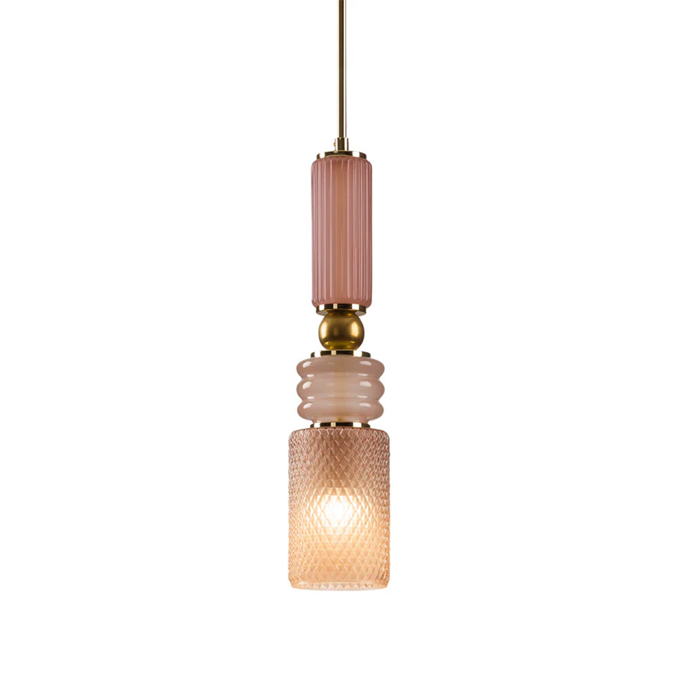 This string pendant lamp is part of the Lolite Collection, paying homage to the extravagant outfits of Lolita. A masterpiece of elegance and artistic craftsmanship, this pendant lamp is a stunning piece of functional decor. Its vertical gold fabric cord is adorned with a stack of porcelain and Murano glass element embellished with delicate grooves on the surface. The shade in mouth-blown Murano glass completes this exquisite work of art.
