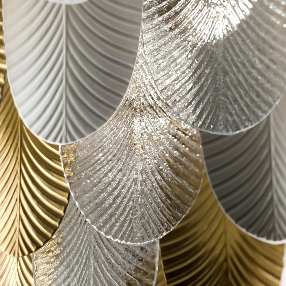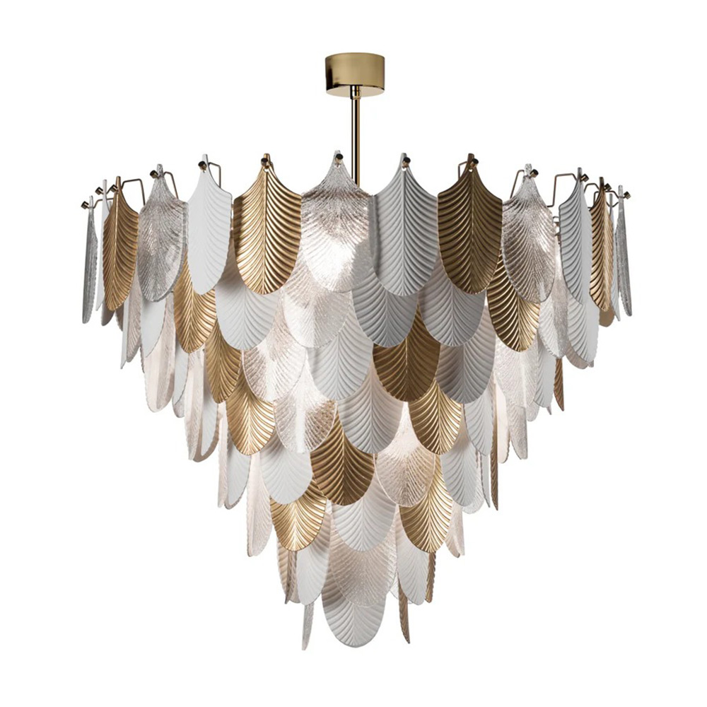 Make a grand statement in the home with this wonderful chandelier inspired by Art Deco and peacock plumage. The structure is made of brass, supporting rows of feather-shaped shades in gold-finished porcelain, white crisp porcelain and mouth-blown Murano glass, shielding the light from the 18 bulbs for a stunning final effect. This work of art exudes mesmerizing allure and is a splendid example of Villari’s exquisite craftsmanship. A magnificent chandelier that will add sophistication and drama to a refined home.