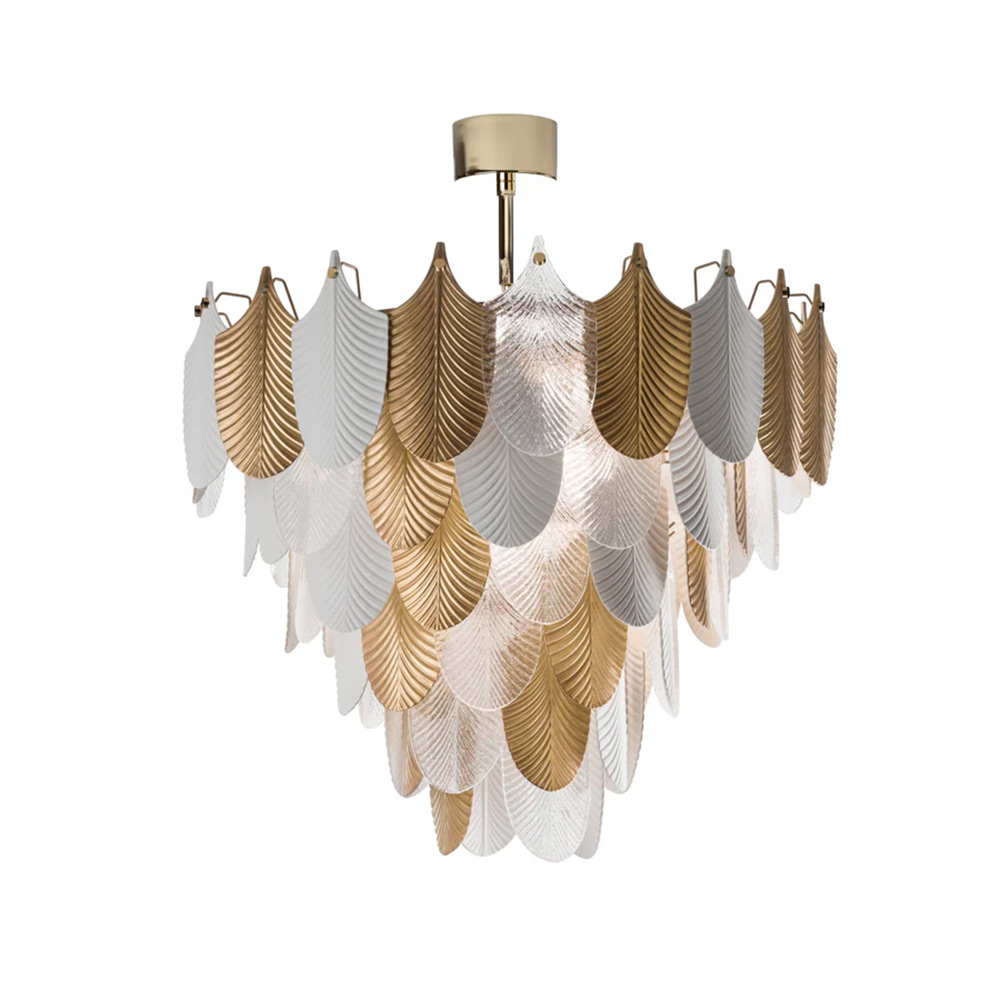 Make a grand statement in the home with this wonderful chandelier inspired by Art Deco and peacock plumage. The structure is made of brass, supporting rows of feather-shaped shades in gold-finished porcelain, white crisp porcelain and mouth-blown Murano glass, shielding the light from the 12 bulbs for a stunning final effect. This work of art exudes mesmerizing allure and is a splendid example of Villari’s exquisite craftsmanship. A magnificent chandelier that will add sophistication and drama to a refined home.