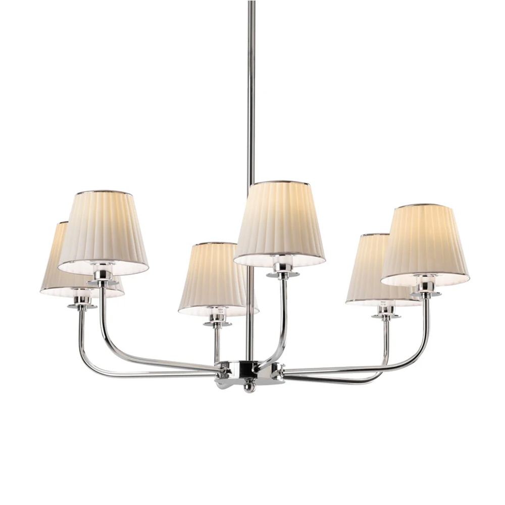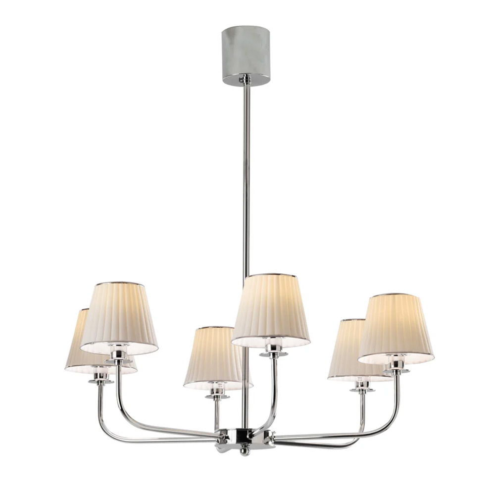 This superb chandelier combines elegance with exquisite craftsmanship. The brass frame has a platinum finish and branches out into six upward-facing arms, each supporting a lampshade in prized matte white porcelain. The diffusers showcase a grooved texture resembling classic lampshades in fabric adding a sublime decorative detail.