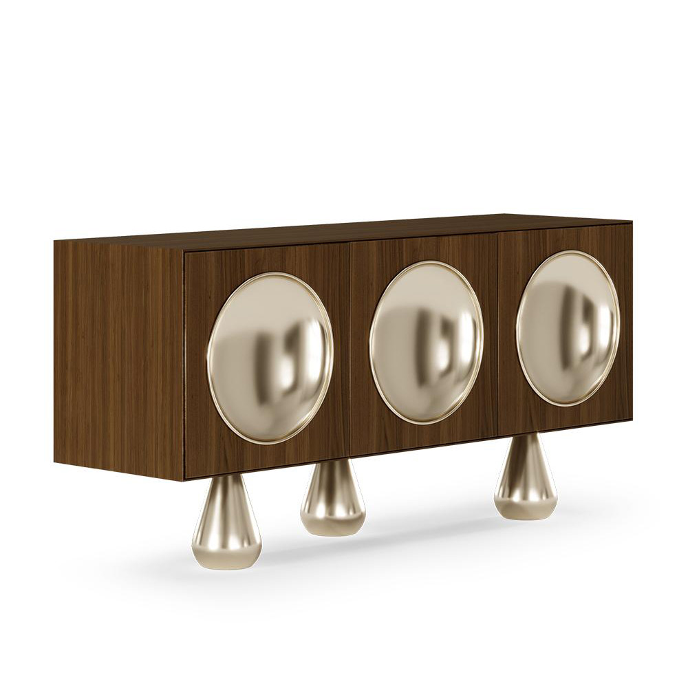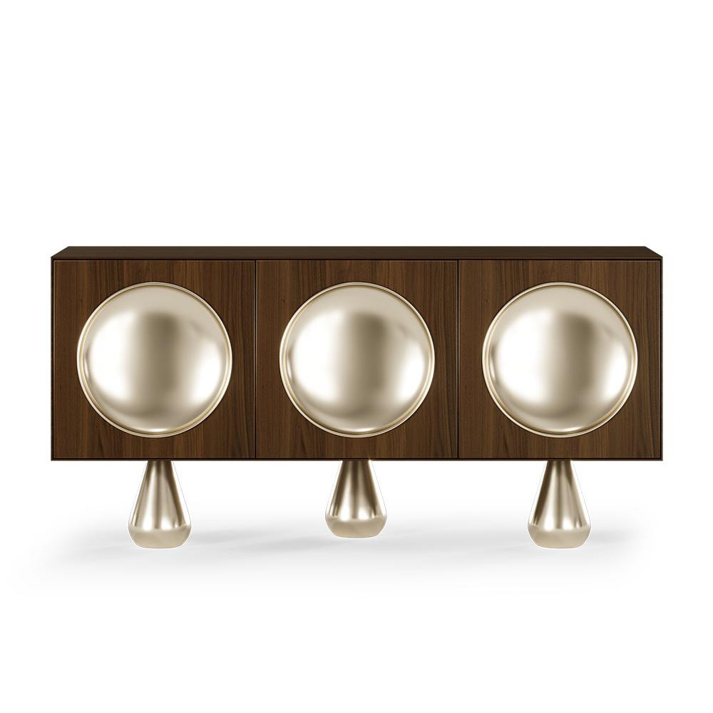 The Aarons Sideboard is a true statement piece, embodying the essence of mid-century design with a bold and sophisticated aesthetic. Its rectangular wooden structure is elevated by three sculptural teardrop-shaped metal legs, adding a sense of lightness and refinement. This piece is a harmonious fusion of organic textures and metallic accents, and is the perfect blend of form and function, bringing timeless elegance to contemporary interiors.