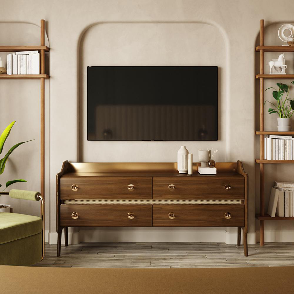 The Lester sideboard draws inspiration from the vintage classics, yet interpreted with a modern vision. The four drawers feature a simple design, where the handles shine, while the main structure brings back the mid-century through its attractive lines.