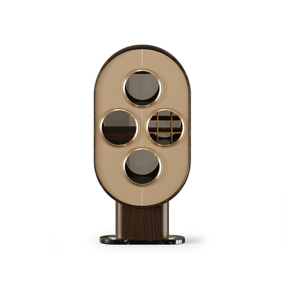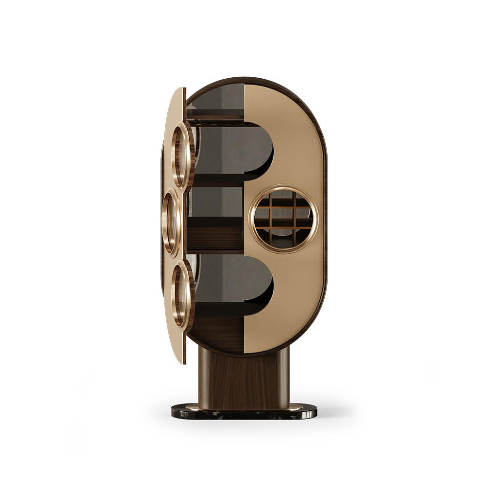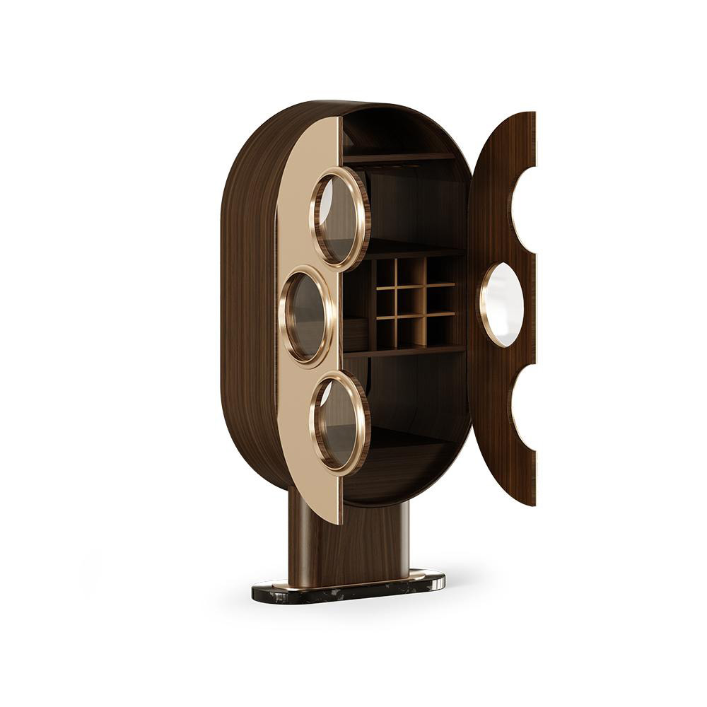 The Marcel Bar Cabinet is a masterpiece of mid-century design, blending functionality with sculptural elegance. Its curved silhouette and symmetrical composition create a bold yet sophisticated presence, while the brass-accented circular inlays add a sense of depth and refinement. The cabinet opens to reveal a meticulously crafted interior designed to elevate the art of entertaining. This statement piece transforms the preparation of a cocktail into a true ritual of pleasure and sophistication.