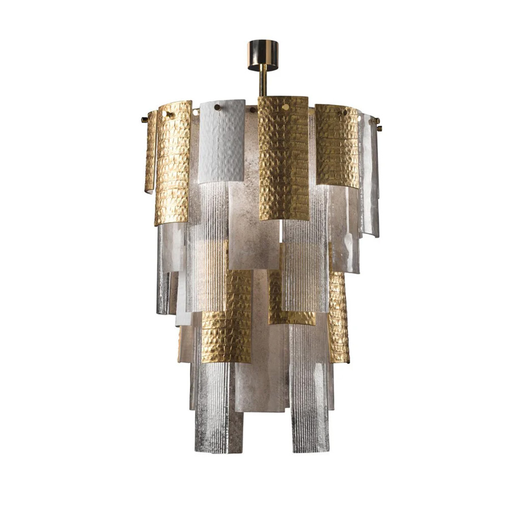 Combining exquisite design with intricate craftsmanship, this chandelier is a masterpiece of sculptural allure compiled of various glass and porcelain textured panels and will infuse your home with Art Deco glamour. Its construction has been Inspired by the song “The wall” as it is actually built brick by brick just like a wall. The brass structure supports a cascade of frosted Murano glass panels featuring deeply embossed vertical grooves and porcelain 24 ct gold hand painted panels featuring a crocodile skin like pattern which lends a luxurious yet organic feel to the whole composition. The 6 bulbs underneath shine brightly to create a sublime ambient light. This modern sculptural chandelier lends adds a chic air and will complement any modern style interior.
