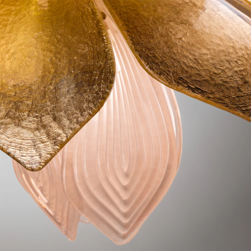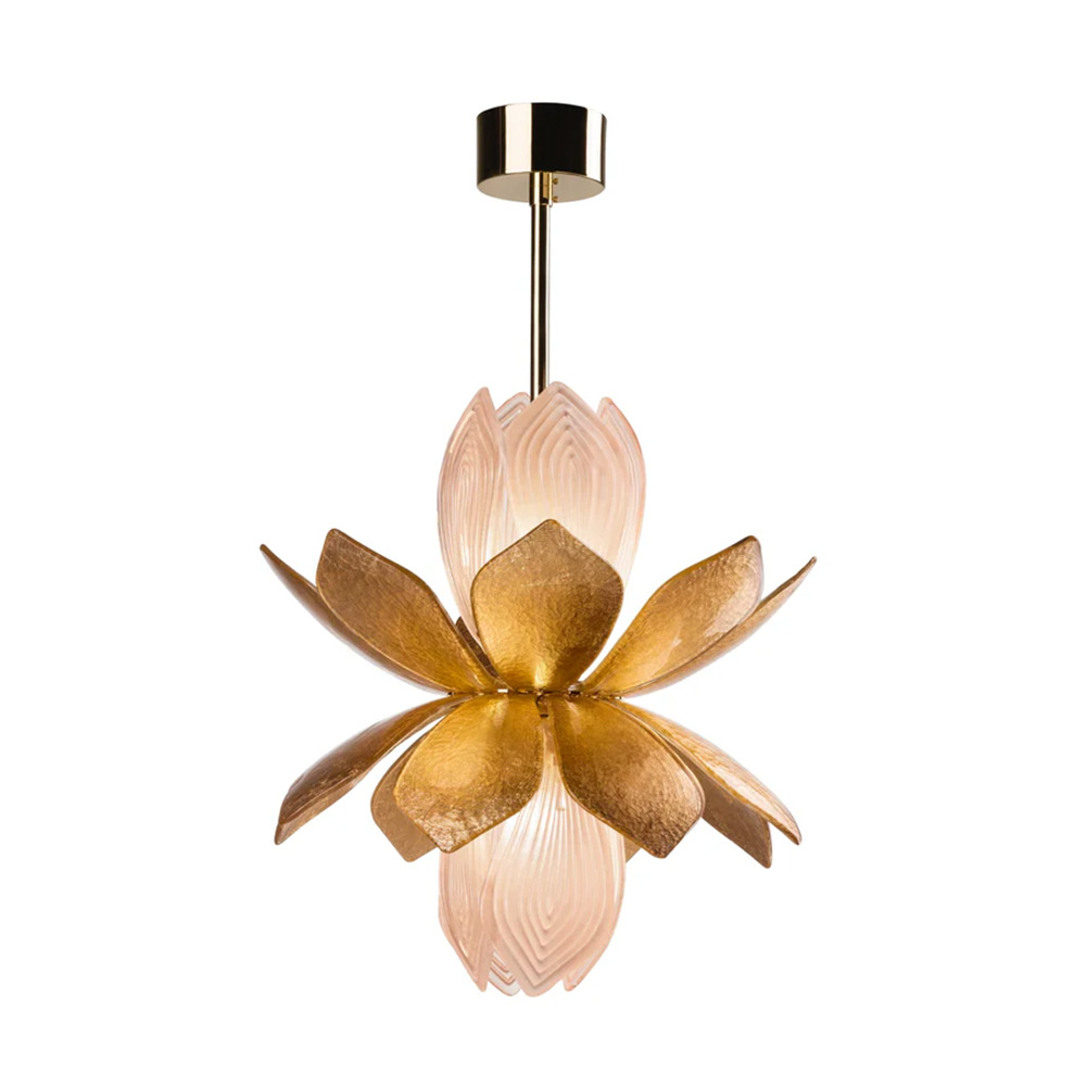 A tribute to the lotus flower, symbol of purity and nobility and virtue, which with its natural charm conquers interiors, TULIP is a Murano glass and bronze-plated brass chandelier.