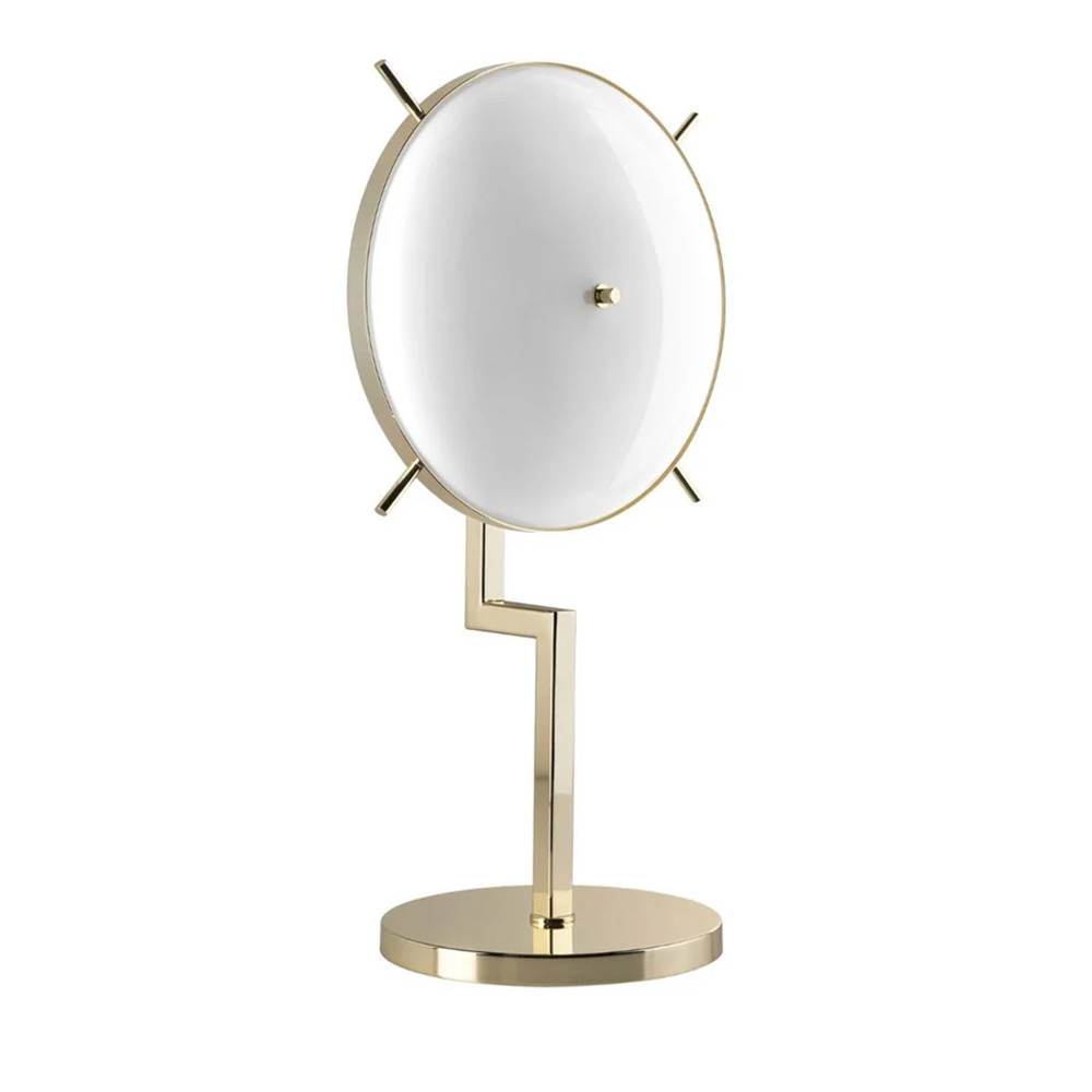 This stunning Venusia Table Lamp which reinterprets Art Deco glamour in a modern and dramatic way. Venusia takes this name from a series of cartoons very popular in the 80s, as with its design is inspired by a UFO but at the same time recalls in the features geometries that bring us back to the Deco design Districts of Miami developed between 1920/30.The 24 ct gld plated brass structure serves as mounting for the stunning mouth-blown Murano glass diffuser, holding two lights and embellished outside with four brass spikes.